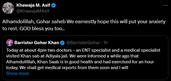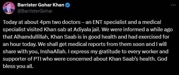 “We were informed a while ago that thank God, Khan sahib is in good health and had exercised for an hour today. Gohar stated, “We will receive medical reports from them shortly, and I will share them with you.”